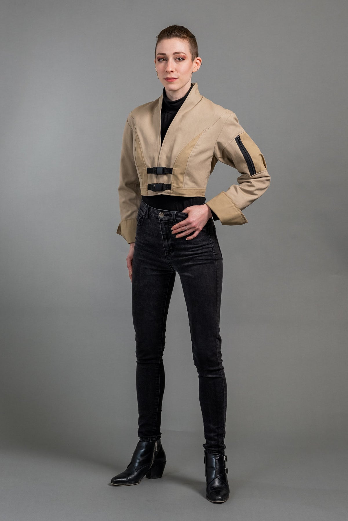 You have the power and you deserve the clothes that say so. The Chuunin Crop jacket is the new kind of power jacket. Be tactical and have a bold impact on your life whenever you wear it. The sleek lines, elegant neckline, and luxe fabric show everyone that you’re a force to be reckoned with while the magnetic closures, durable construction, and rebellious cut let everyone know that you’re not afraid to take risks. Dominate the playing field, seize the opportunity, and take control of your life wearing the Chuunin Crop.