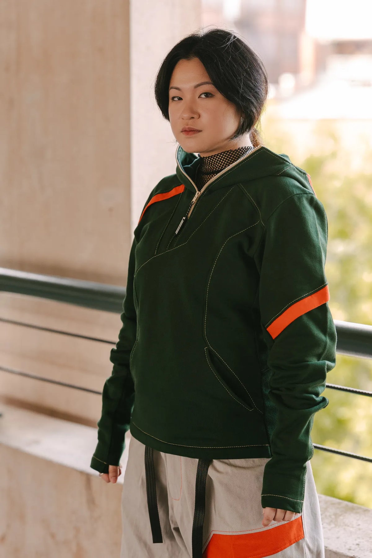 - Mikey - Green with orange accents, tan topstitching, and tan zipper with custom zipper pull