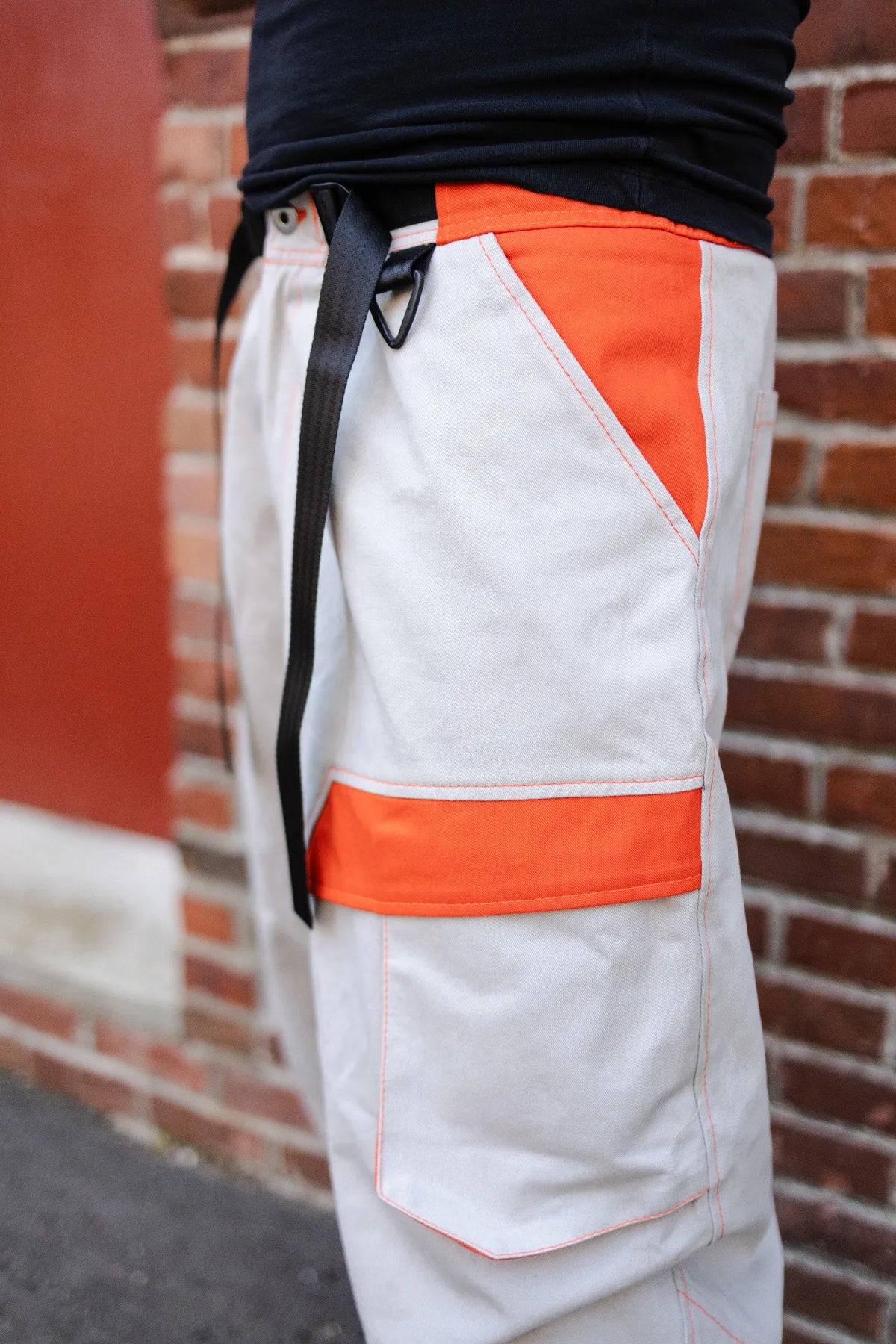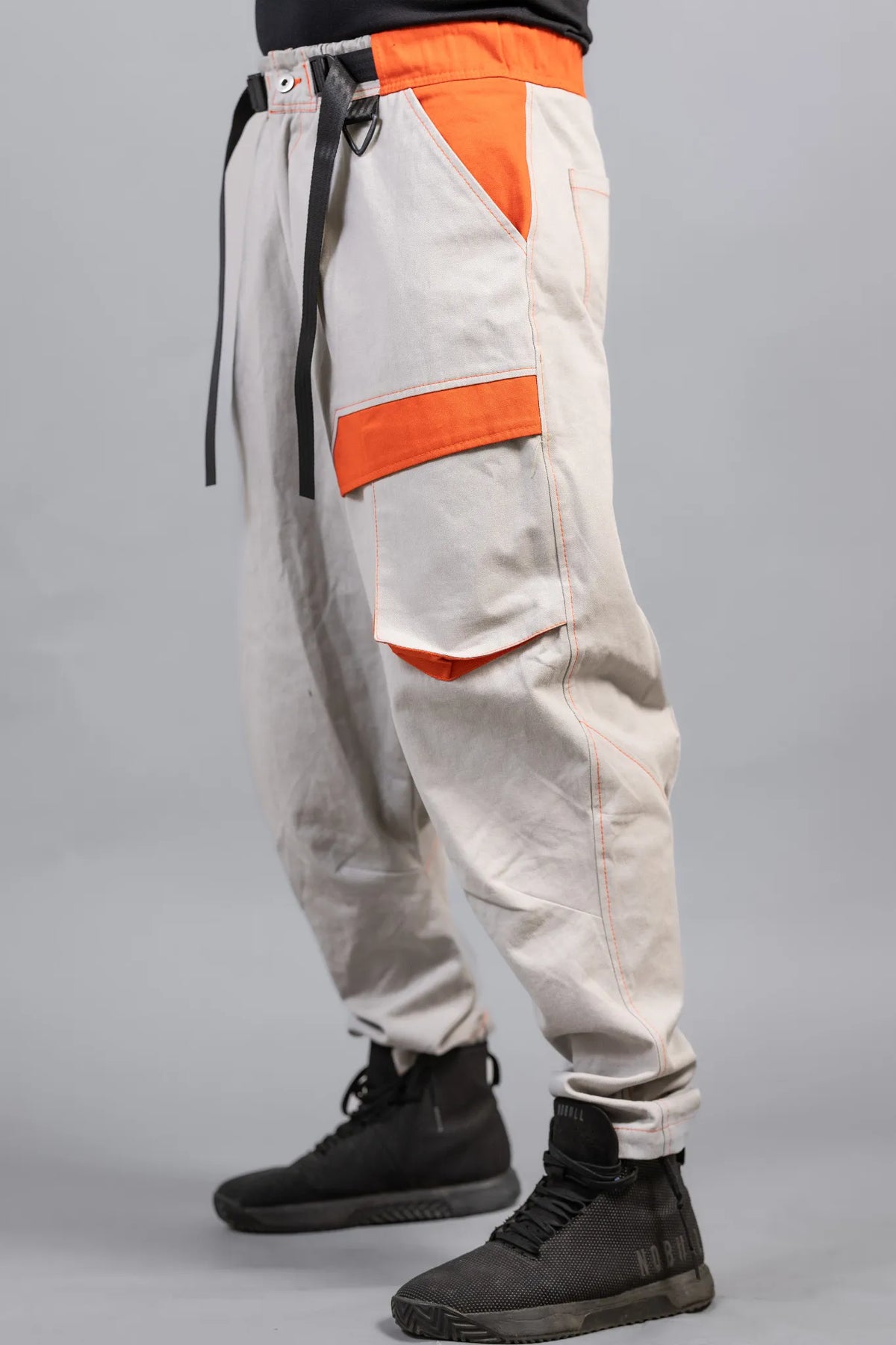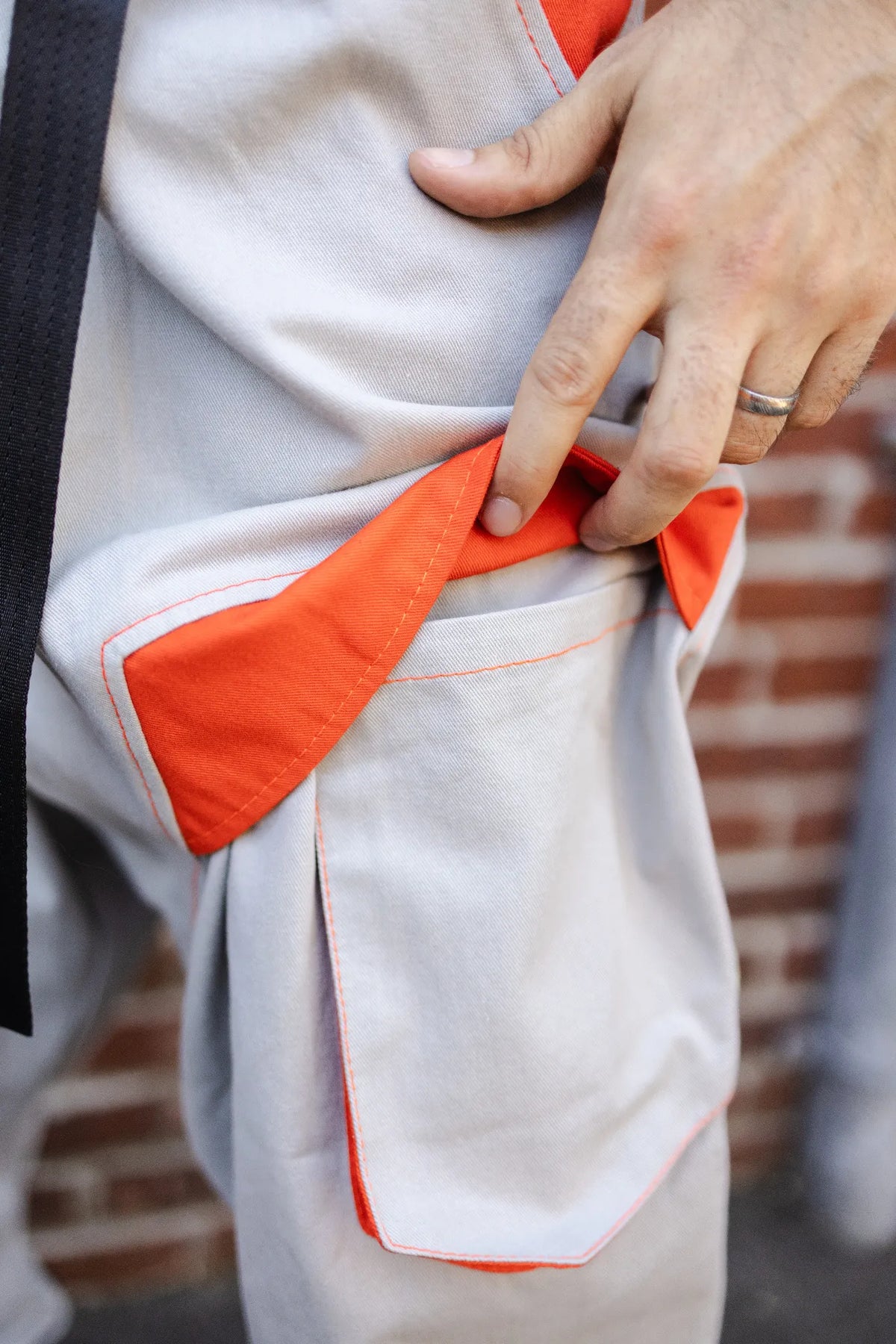 - Lunar Dust - Light gray with orange accents, black belt & hardware, and orange topstitching