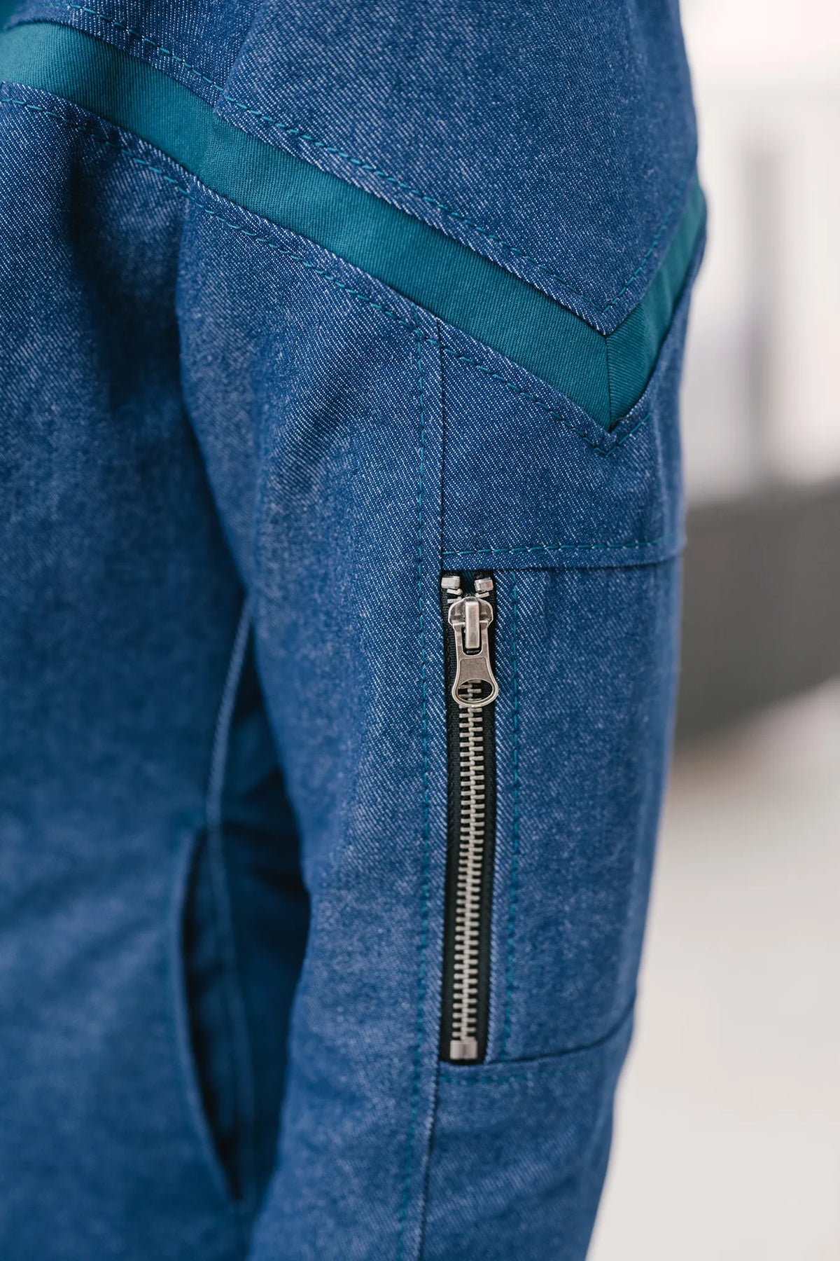 - Sciences Teal - Blue denim with teal accents, teal topstitching, and antique nickel buttons and zipper