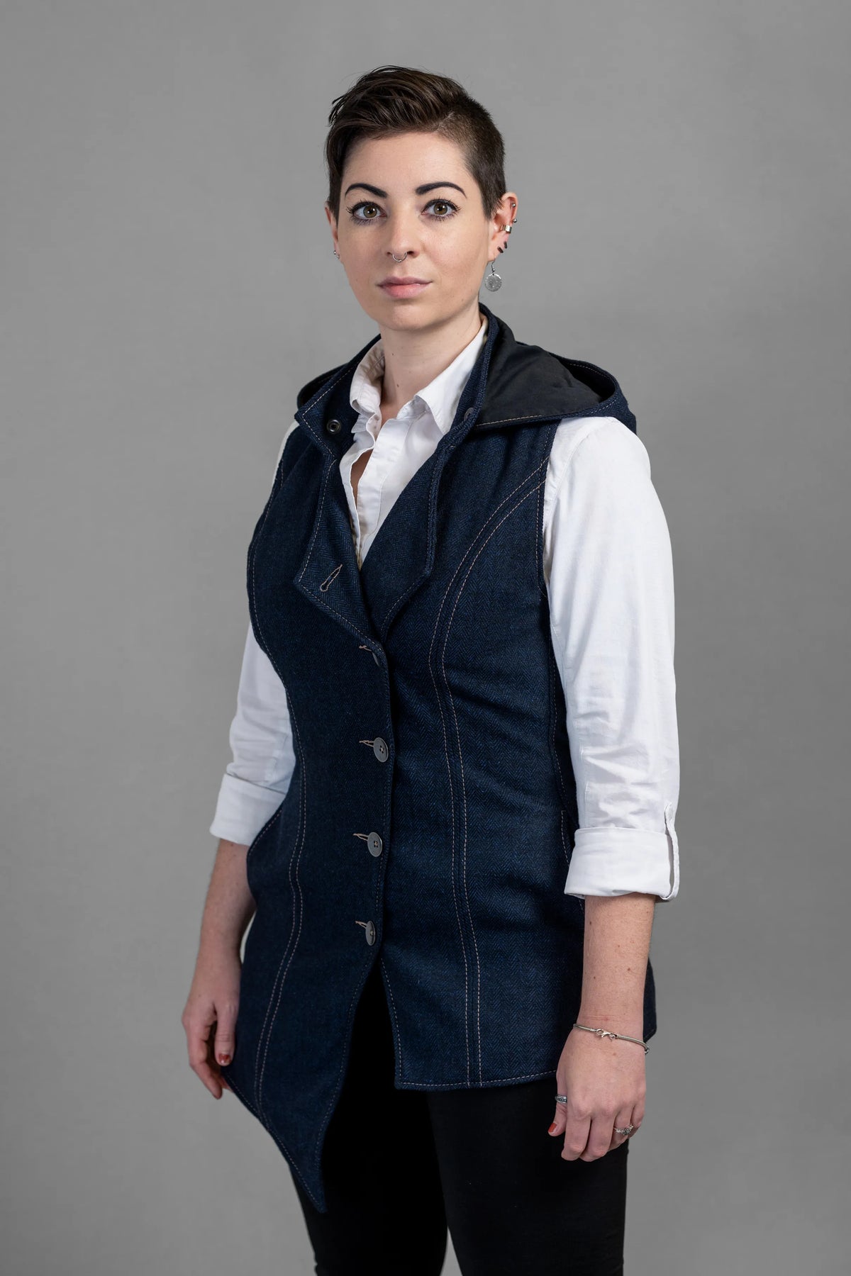 Leslie is 5'2" and wearing the Corvo Vest in size 37W.