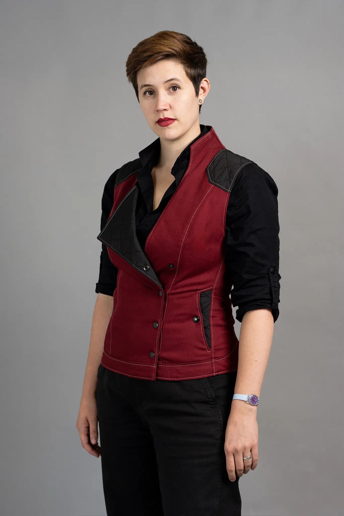 Willow is 5'10" and wearing the Smuggler Vest in size 35W