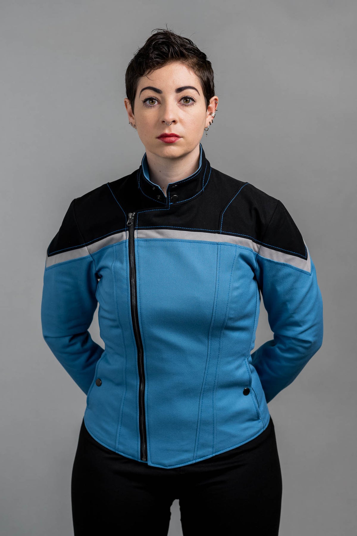The semi-moto zip front closure and dual snap collar looks perfect on the (Lower) decks of the USS Cerritos or out with friends.